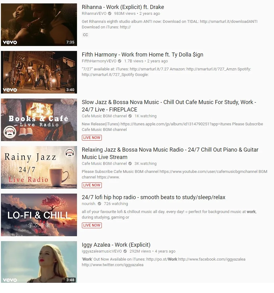 But a YouTube search also found a bunch of music videos, seemingly unrelated to work! Still, they all had work in their title or description...